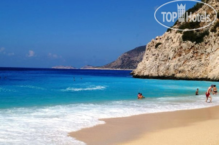 Свой собственный пляж с мелко галечным/ песчаным заходом в воду. Море чистое, бирюзовое, ради чего, собственно, многие и едут в Олюдениз.