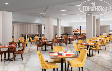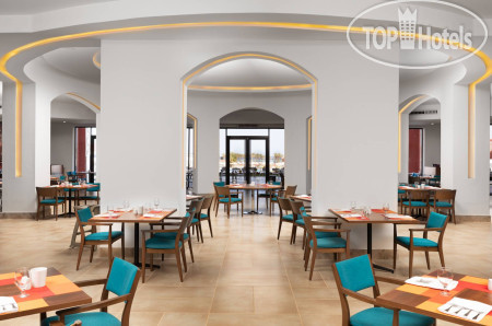 Ресторан отеля это два зада на первом этаже и терраса с панорамным видом на отель, бассейны и море и зал на втором этаже с террасой, находятся друг над другом, конечно со второго этажа виды на отель и море восхитительны! Кухня разнообразная. Ежедневно в рационе курица, рыба, мясо, овощи, фрукты, соки, сладости, есть отдельное детское меню и зона для родителей с детьми и марокканская кухня. Всегда все свежее, очень вкусно!