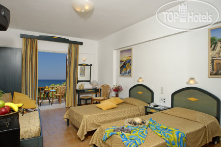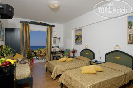 Номера чистые, с ремонтом. Большинство номеров - side sea view, уютная терраса в каждом номере. В номере висит большая ТВ-плазма, российских каналов правда нет, но они и ни к чему, мы телевизор не смотрели, только Евровидение 1 раз на греческом канале.