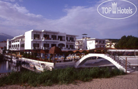 Территория у отеля небольшая, 2 корпуса, 2 бассейна, детсткая игровая площадка. У отеля протекает речушка, в ней часто плавают гуси, ребенок их с удовольствием подкармливал))) В отеле 2 песчаных пляжа (один через мостик через эту речушку, второй через дорогу). Если пройти чуть дальше по пляжу до пирса с церквушкой - можно искупать в воде потеплее и поваляться на песочке помельче)))