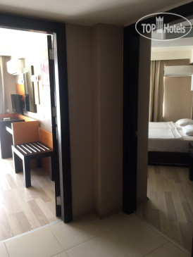 Заселили в 14:00 как положено. Номер хороший, просторный с видом на соседний отель и горы. Дверь в соседний номер около кровати у дивила В номере чисто, есть дефекты (душ покоцанный, полочки оторваны, где-то оторваны обои), но это все мелочи!