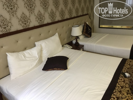 По прибытию нас поселили в номер 703, очень маленький. После некоторых разборок, включая и участие представителя туроператора, нас переселили в номер 1401. Как нам объяснили, что под данную категорию попадают 4 номера, в т.ч. и 703. По разъяснению представителя туроператора, отель продает дважды номера, и мы попали в такую ситуацию, но всего на одни сутки. За эти сутки отремонтировали этом номере кондиционер, сейф, холодильник (как нам сказали, что это охладитель и он НЕ должен охлаждать, мы долго смеялись 😊). В номерах есть два вафельных халата, чайник, два стакана, две чайные пары, 2 бутылочки воды по 350 мл. В номере 1401 есть ванная, нам это не удобно, но ищем плюсы - хорошо постирать одежду после моря. Подушки очень не удобные. Потолок в форме сердца, с фиолетовой подсветкой, зеркало в ванной тоже в форме сердца, видимо когда-то это был номер для молодоженов. Освещение в номере оставляет желать лучшего. Тюлевые шторы совсем в плачевном состоянии. Кодовый замок на сейфах в обоих номерах был сломан. Боялись его оторвать совсем.