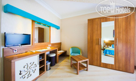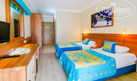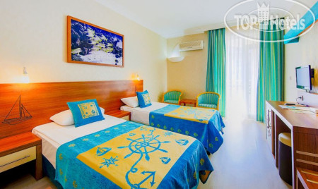 Отдыхали с подругой и детьми 11и 12 лет. Отдых понравился!!!Отель супер! В номере чистота,уборка каждый день. Отель построен в виде кораблей в бирюзовом цвете и находиться в живописном месте вокруг отеля красивейшие горы. На территории отеля огромный аквапарк дети наши не выходили из бассейнов и каждый день не по часу катались с горок. Они в полном восторге!!!! Недалеко от бассейнов находиться мини кафе с фастфудом ,что очень удобно покушал и снова можно развлекаться. Море чистейшее,но очень соленое. В море очень много рыбок, плывешь и они рядом. Еда в отеле разнообразная,очень вкусная и всегда все свежее. Персонал приветливый разговаривают и на русском и на английском языке. Отдыхает много людей из разных стран,что придает определенный колорит отдыху. Вечером пол девятого для детей проводят дискотеку а в половине десятого вечера начитается ночное шоу для взрослых. Программа очень насыщенная и всегда яркая и красочная,скучать нее придется. Днем так же для детей проводят очень много мастер-классов. А взрослые могут заняться аквааэробикой либо покидать дартс.Один раз в недель для туристов бесплатно предлагают посетить А-ля-карт с выбором еды: либо рыба- либо кебаб, советуем посетить не пожалеете очень все вкусно и красиво!!! Неподалеку от отеля находится мини маркет в котором работают замечательные люди Даша и Рашид. Покупали у Рашида экскурсию в Демре Мира Кеково экскурсия была просто шикарная и включала в себя очень много локаций. Мы получили массу положительных эмоций!!!Экскурсии у Рашида значительно дешевле чем где Рекомендуем!!! А у Даши огромный выбор товара и дешевый и качественный все проверили по приезду домой вкуснейший кофе гранатовый, чай, свежайший рахат лукум и тд. Даше выражаем огромную благодарность за советы по приобретению товара и желаем побольше благодарных покупателей!!!