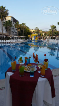 Это был первый отель, который мне настолько сильно запомнился. Еда, развлечения, море, бар, персонал - все на высшем уровне!!! Море находится безумно близко к отелю. Этот тот самый отель, в котором всё достаточно и близко. Покушать можно почти круглосуточно, прекрасный выбор алкоголя и напитков, закусок и полноценных блюд. Есть несколько баров: Enjoy Bar (самый большой), на пирсе, ресепшене, у водных горок и у сцены, где каждый вечер проходят различные программы. Каждую субботу проходят вечеринки на пирсе с салютами и напитками. Весь день расписан и каждый сможет найти, чем ему заняться (водное поло, гимнастика, зумба, волейбол и др). Номера очень чистые и удобные. Отдельную благодарность хотелось бы выразить аниматорам, которые постоянно радовали нас улыбками, приятными разговорами, шутками и компанией на развлечениях. Бармены тоже были веселые и делали прекрасные коктейли. На территории отеля так же есть кофейня (на входе в отель слева), в которой мне постоянно делала кофе очень приятная и милая девушка. Расположение отеля от населенных пунктов очень приятное. Автобусная остановка находиться близки, хоть и приходится немного пройтись. До Конаклы 10-15 минут на автобусе, а до Аланьи 20-30 минут. Единственным минусом я бы отметила а-ля карт, в котором у нас не было выбора, кроме типа а-ля карта, и вся еда была сильно жирная, но я все равно с удовольствием приехала бы в этот отель еще раз!