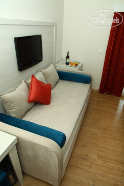 В номере: гель, мыло в дозаторе, шапочка для душа, тапочки, сейф бесплатный. В небольшом номере стандарт у нас 1 большая кровать, ребенок спал на диване (он не раскладывается). Балкон маленький. Постель приятная, подушки удобные. В целом номер хороший. Я не говорила, что я турагент, т.к. хотела посмотреть, какие же номера дают всем.