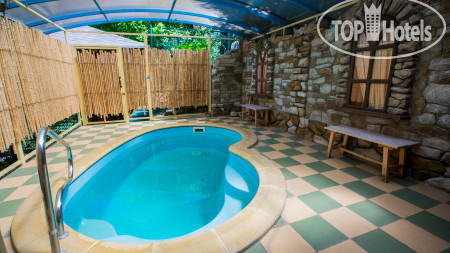 Бассейнов несколько, есть 2 маленькие и чуть побольше, маленькие холоднее. Побольше, теплее, можно поплавать.... Но ОН тоже маленький, 3*5 где-то, лежаков всегда хватало, есть зонтики. Полотенца брали из номера.